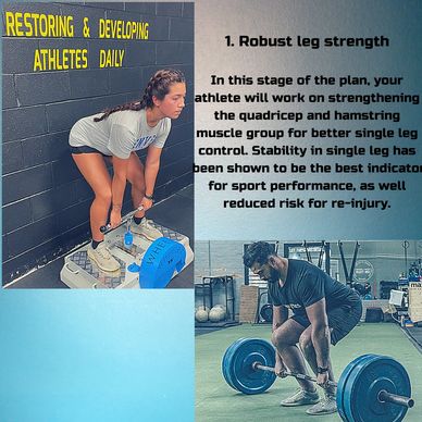 In this stage of the plan, your athlete will work on strengthening the quadricep and hamstring muscle group for better single leg control. Stability in single leg has been shown to be the best indicator for sport performance, as well reduced risk for re-injury.