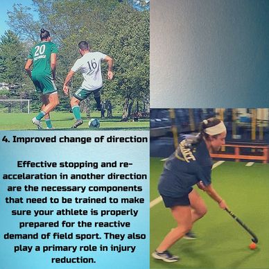 Effective stopping and re-accelaration in another direction are the necessary components that need to be trained to make sure your athlete is properly prepared for the reactive demand of field sport. They also play a primary role in injury reduction.